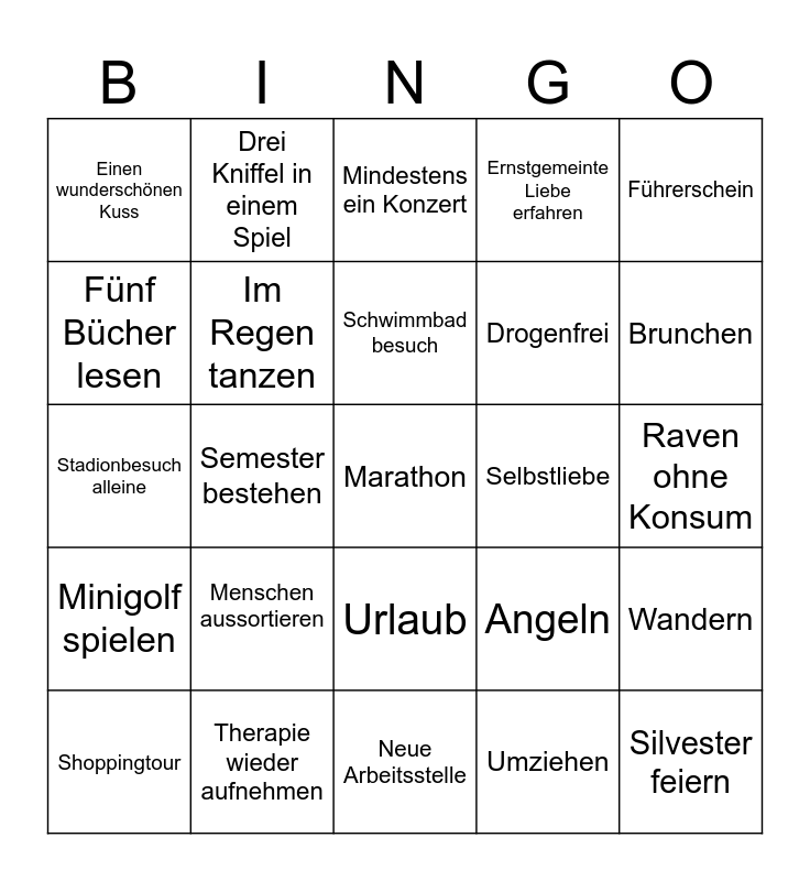 This bingo card has a free space and 24 words: Menschen aussortieren, Therapie wieder aufnehmen, Schwimmbad besuch, Shoppingtour, Führerschein, Einen wunderschönen Kuss, Fünf Bücher lesen, Drei Kniffel in einem Spiel, Selbstliebe, Urlaub, Drogenfrei, Stadionbesuch alleine, Angeln, Wandern, Im Regen tanzen, Umziehen, Raven ohne Konsum, Mindestens ein Konzert, Brunchen, Semester bestehen, Silvester feiern, Minigolf spielen, Ernstgemeinte Liebe erfahren and Neue Arbeitsstelle.