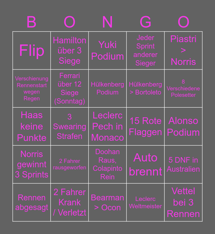 This bingo card has a free space and 24 words: Rennen abgesagt, 2 Fahrer rausgeworfen, Hülkenberg Podium, Leclerc Weltmeister, Piastri > Norris, Flip, Hamilton über 3 Siege, Yuki Podium, 15 Rote Flaggen, Alonso Podium, Haas keine Punkte, Ferrari über 12 Siege (Sonntag), Auto brennt, 5 DNF in Australien, Verschienung Rennenstart wegen Regen, 2 Fahrer Krank / Verletzt, Bearman > Ocon, Jeder Sprint anderer Sieger, 8 Verschiedene Polesetter, Norris gewinnt 3 Sprints, 3 Swearing Strafen, Doohan Raus, Colapinto Rein, Hülkenberg > Bortoleto and Vettel bei 3 Rennen.