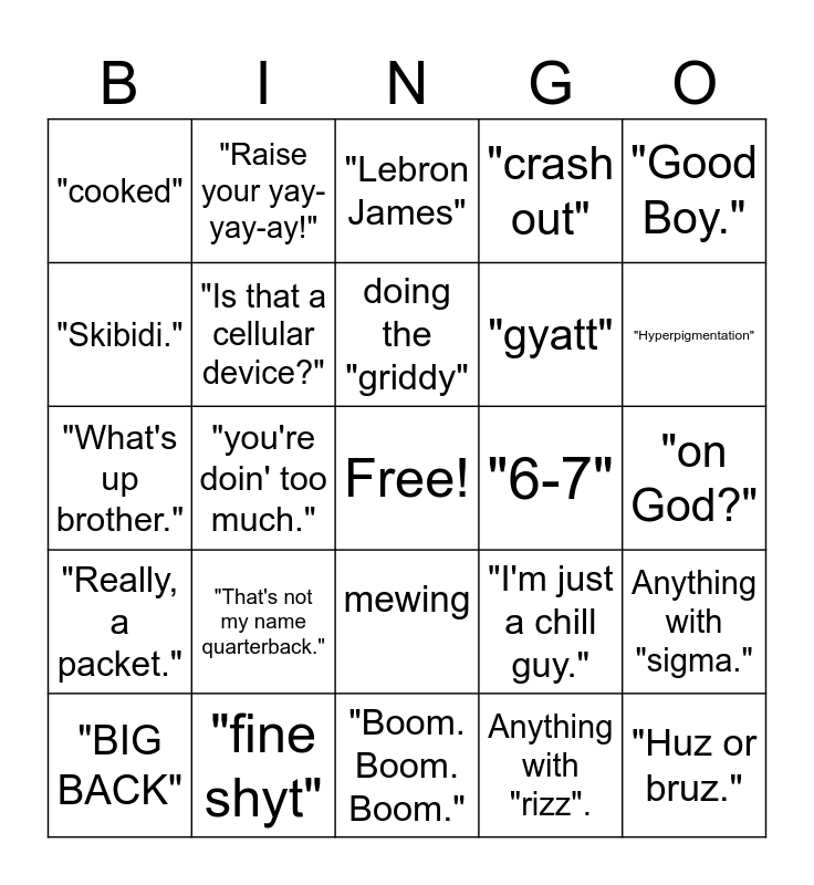 This bingo card has a free space and 24 words: "That's not my name quarterback.", "fine shyt", doing the "griddy", "BIG BACK", "Good Boy.", "cooked", "Skibidi.", "Raise your yay-yay-ay!", "6-7", mewing, "gyatt", "What's up brother.", "I'm just a chill guy.", Anything with "sigma.", "Is that a cellular device?", Anything with "rizz"., "on God?", "Lebron James", "Hyperpigmentation", "you're doin' too much.", "Huz or bruz.", "Really, a packet.", "crash out" and "Boom. Boom. Boom.".