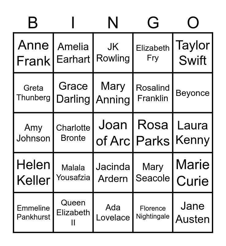 This bingo card has 25 words: Helen Keller, Queen Elizabeth II, Joan of Arc, Florence Nightingale, Taylor Swift, Anne Frank, Amelia Earhart, JK Rowling, Rosa Parks, Marie Curie, Greta Thunberg, Grace Darling, Ada Lovelace, Mary Seacole, Beyonce, Emmeline Pankhurst, Charlotte Bronte, Mary Anning, Rosalind Franklin, Laura Kenny, Amy Johnson, Malala Yousafzia, Jacinda Ardern, Elizabeth Fry and Jane Austen.