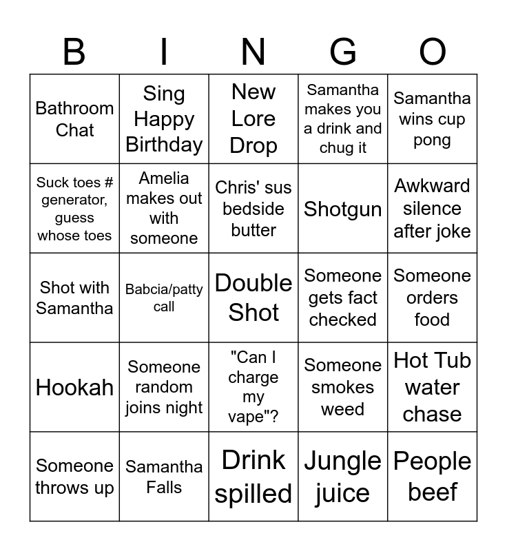 This bingo card has a free space and 29 words: Someone throws up, Someone goes to bed before 12, Babcia/patty call, Someone Disappears, Bathroom Chat, New Lore Drop, Amelia makes out with someone, Someone random joins night, Someone gets fact checked, Samantha Falls, Someone orders food, People beef, Drink spilled, Jungle juice, Awkward silence after joke, Unfinished story, "Can I charge my vape"?, Hookah, Samantha wins cup pong, Shot with Samantha, Someone smokes weed, Andre blushes, Shotgun, Suck toes # generator, guess whose toes, Samantha makes you a drink and chug it, Sing Happy Birthday, Hot Tub water chase, Chris' sus bedside butter and Someone's too loud so it goes quiet.