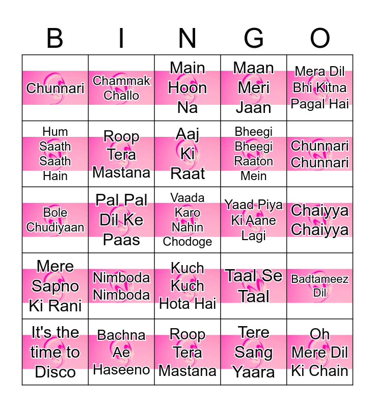 This bingo card has 36 images and 36 words: Aaj Kal Tere Mere, Bang Bang, Kajra Re Kajra Re, Bheegi Bheegi Raaton Mein, Badtameez Dil, It's the time to Disco, Roop Tera Mastana, Dilbar Dilbar, Maan Meri Jaan, Dil Diyan Gallan, Bole Chudiyaan, Chammak Challo, Kuch Kuch Hota Hai, Tere Sang Yaara, Chaiyya Chaiyya, Chunnari, Bachna Ae Haseeno, Main Hoon Na, Taal Se Taal, Mera Dil Bhi Kitna Pagal Hai, Mere Sapno Ki Rani, Nimboda Nimboda, Aaj Ki Raat, Chand Mera Dil, Oh Mere Dil Ki Chain, Hum Saath Saath Hain, Pal Pal Dil Ke Paas, Roop Tera Mastana, Yaad Piya Ki Aane Lagi, Chunnari Chunnari, Tum Bin, Mein toh ainvayi ainvayi, Vaada Karo Nahin Chodoge, Yeh Jo Mohobbat Hai, Yeh Sama- Sama Hai Yeh Pyar Ka and Zindagi Ke Safar Mein.
