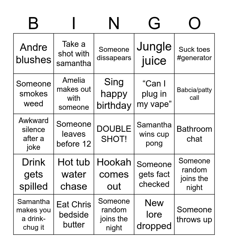 This bingo card has a free space and 24 words: Hot tub water chase, Eat Chris bedside butter, Sing happy birthday, Samantha makes you a drink- chug it, Suck toes #generator, Andre blushes, Someone smokes weed, Take a shot with samantha, Samantha wins cup pong, Hookah comes out, “Can I plug in my vape”, Awkward silence after a joke, Someone gets fact checked, Someone random joins the night, Amelia makes out with someone, New lore dropped, Bathroom chat, Someone dissapears, Babcia/patty call, Someone leaves before 12, Someone throws up, Drink gets spilled, Jungle juice and Someone random joins the night.