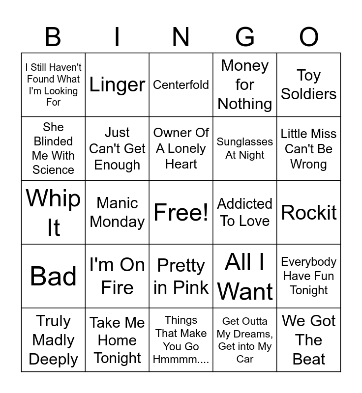 This bingo card has a free space and 40 words: Careless Whisper, Whip It, Burning Down the House, Just Can't Get Enough, Take Me Home Tonight, Pretty in Pink, Owner Of A Lonely Heart, Rock Me Amadeus, Toy Soldiers, Bad, Manic Monday, Money for Nothing, We Got The Beat, Rockit, Addicted To Love, I'm On Fire, Beds Are Burning, I Still Haven't Found What I'm Looking For, Push It, Centerfold, Everybody Have Fun Tonight, Get Outta My Dreams, Get into My Car, Sunglasses At Night, She Blinded Me With Science, Venus, Cars, Straight Up, Torn, Drive, The River of Dreams, Alive, Truly Madly Deeply, So Much to Say, All I Want, Little Miss Can't Be Wrong, Things That Make You Go Hmmmm...., Mama, I'm Coming Home, Follow You Down, Linger and Are You Jimmy Ray?.