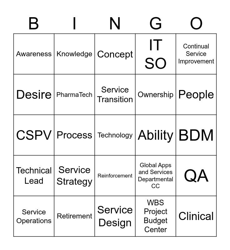 This bingo card has 25 words: Service Strategy, Service Design, Service Transition, Service Operations, Continual Service Improvement, Awareness, Desire, Knowledge, Ability, Reinforcement, Ownership, CSPV, Global Apps and Services Departmental CC, QA, PharmaTech, Clinical, BDM, Concept, People, Process, Technology, Retirement, Technical Lead, IT SO and WBS Project Budget Center.