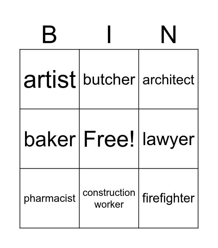 This bingo card has a free space and 18 words: Accountant, actor, architect, artist, assembler, baker, bus driver, butcher, construction worker, farmer, delivery person, firefighter, fisherman, lawyer, pharmacist, police officer, taxi driver and waiter.