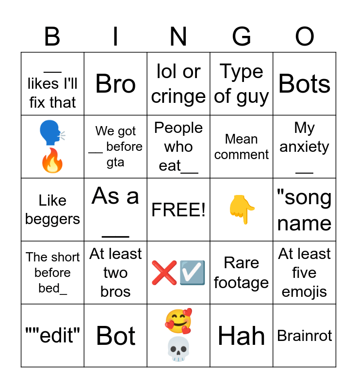 This bingo card has a free space and 25 words: At least two bros, 🥰💀, People who eat__, ""edit", Bots, __ likes I'll fix that, 🗣️🔥, Bro, 👇, ❌☑️, Mean comment, Like beggers, Rare footage, At least five emojis, We got __ before gta, Cringe comment, "song name, lol or cringe, My anxiety __, As a __, Brainrot, Bot, The short before bed_, Type of guy and Hah.