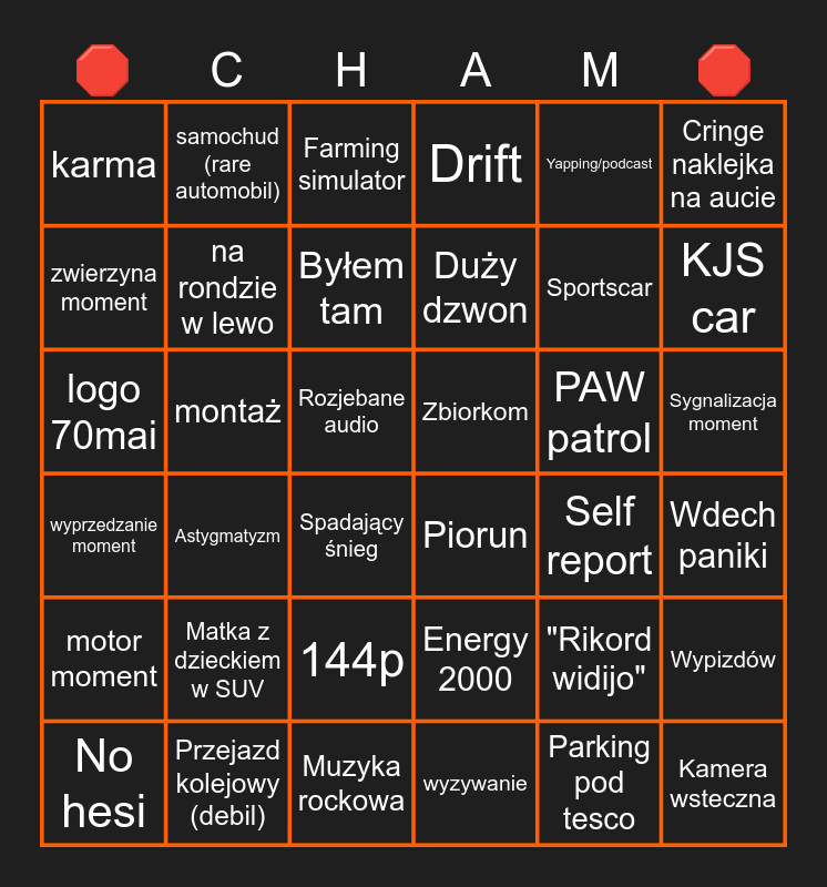 This bingo card has 58 words: Bus moment, Piorun, NPC, Zbiorkom, Wdech paniki, Szeryfowanie, zwierzyna moment, Lublean, Byłem tam, Polska autoskola, Drift, Jazda pod prąd, No hesi, Wypizdów, Polska powiatowa, karma, logo 70mai, Yapping/podcast, rozmowa, na rondzie w lewo, montaż, Farming simulator, Spadający śnieg, Astygmatyzm, Astygmatyzm druptexa, Rozjebane audio, Energy 2000, Nagranie telefonem, Duży dzwon, Muzyka rockowa, ETS2, Kamera wsteczna, Polskie rapsy, "Będzie na stop chama", Matka z dzieckiem w SUV, Przejazd kolejowy (debil), przejście dla pieszych, KJS car, Sportscar, FSO car, PAW patrol, motor moment, wyprzedzanie moment, sprzeczka/bójka, Rzadkie blachy, Overreaction, Wymuszenie pierwszeństwa, Sygnalizacja moment, Self report, Za długi klakson, Parking pod tesco, 144p, "Rikord widijo", wyzywanie, samochud (rare automobil), doxxująca szybka, Cringe naklejka na aucie and Taxi.