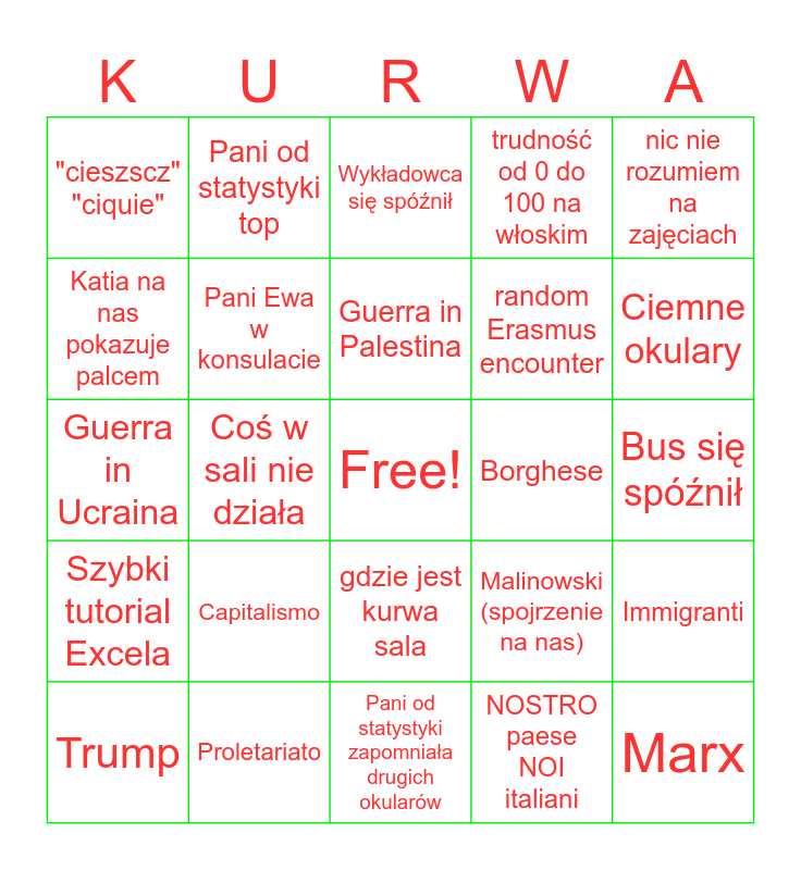 This bingo card has a free space and 24 words: Capitalismo, Proletariato, Guerra in Palestina, Trump, nic nie rozumiem na zajęciach, "cieszscz" "ciquie", Katia na nas pokazuje palcem, Pani od statystyki top, Borghese, gdzie jest kurwa sala, random Erasmus encounter, Guerra in Ucraina, Malinowski (spojrzenie na nas), Immigranti, Pani Ewa w konsulacie, NOSTRO paese NOI italiani, Bus się spóźnił, Wykładowca się spóźnił, Ciemne okulary, Coś w sali nie działa, Marx, Szybki tutorial Excela, trudność od 0 do 100 na włoskim and Pani od statystyki zapomniała drugich okularów.