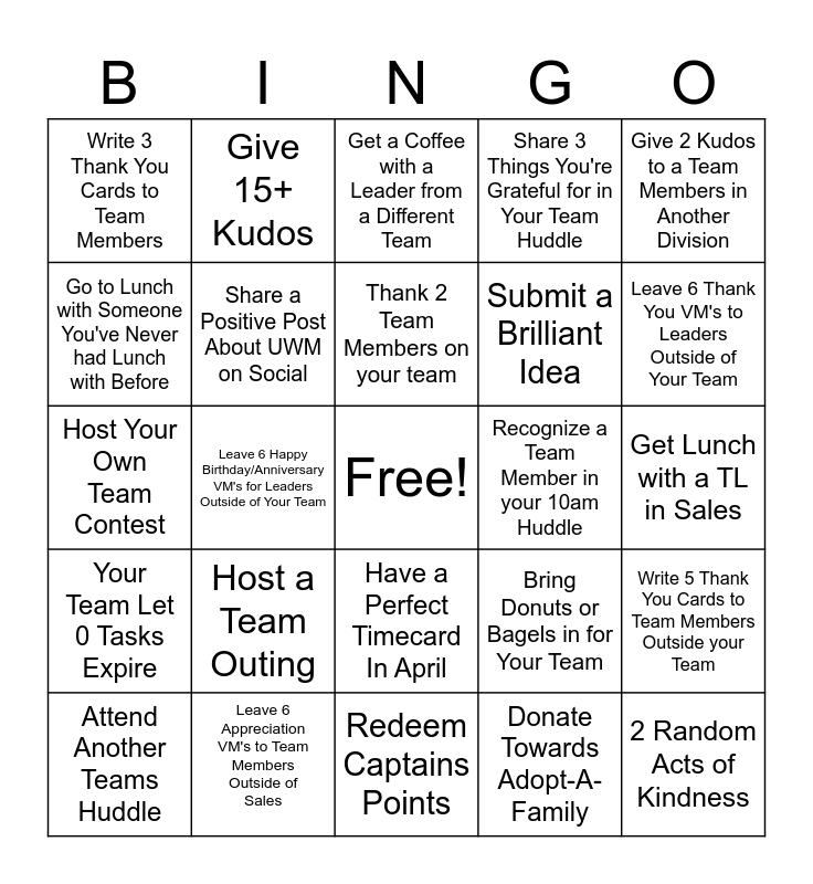 This bingo card has a free space and 24 words: Attend Another Teams Huddle, Host a Team Outing, Thank 2 Team Members on your team, Donate Towards Adopt-A-Family, Give 2 Kudos to a Team Members in Another Division, Write 3 Thank You Cards to Team Members, Give 15+ Kudos, Get a Coffee with a Leader from a Different Team, Recognize a Team Member in your 10am Huddle, Get Lunch with a TL in Sales, Host Your Own Team Contest, Share a Positive Post About UWM on Social, Bring Donuts or Bagels in for Your Team, Write 5 Thank You Cards to Team Members Outside your Team, Go to Lunch with Someone You've Never had Lunch with Before, Leave 6 Appreciation VM's to Team Members Outside of Sales, Redeem Captains Points, Share 3 Things You're Grateful for in Your Team Huddle, Leave 6 Thank You VM's to Leaders Outside of Your Team, Your Team Let 0 Tasks Expire, Leave 6 Happy Birthday/Anniversary VM's for Leaders Outside of Your Team, Have a Perfect Timecard In April, Submit a Brilliant Idea and 2 Random Acts of Kindness.