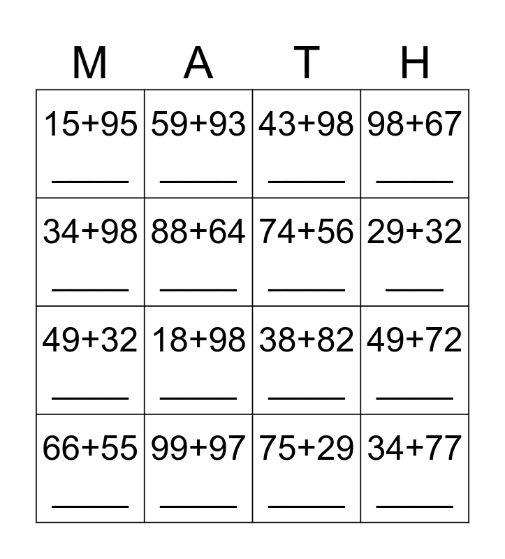 This bingo card has 32 words: 89+29 ____, 49+27 ____, 75+29 ____, 66+48 ____, 66+55 ____, 88+64 ____, 43+98 ____, 87+34 ____, 34+98 ____, 56+44 ____, 74+56 ____, 98+67 ____, 67+78 ____, 63+68 ____, 74+18 ____, 66+78 ____, 69+18 ____, 18+98 ____, 79+44 ____, 34+77 ____, 98+78 ____, 27+84 ____, 44+86 ____, 62+59 ____, 49+32 ____, 59+93 ____, 38+82 ____, 29+32 ___, 15+95 ____, 99+97 ____, 84+77 ____ and 49+72 ____.