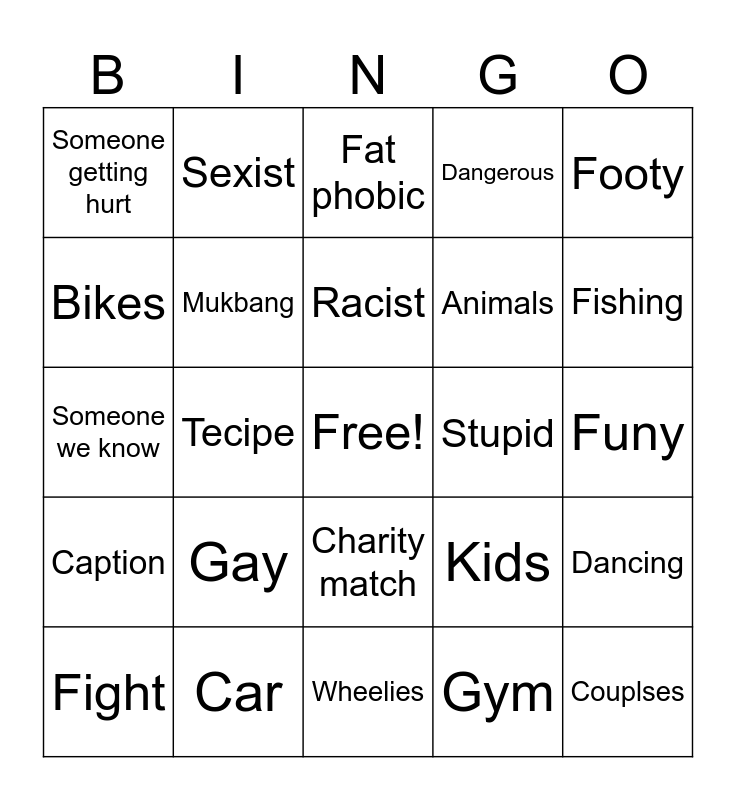 This bingo card has a free space and 24 words: Fight, Gay, Racist, Gym, Footy, Someone getting hurt, Sexist, Fat phobic, Stupid, Funy, Someone we know, Mukbang, Kids, Dancing, Bikes, Car, Wheelies, Dangerous, Fishing, Caption, Tecipe, Charity match, Animals and Couplses.