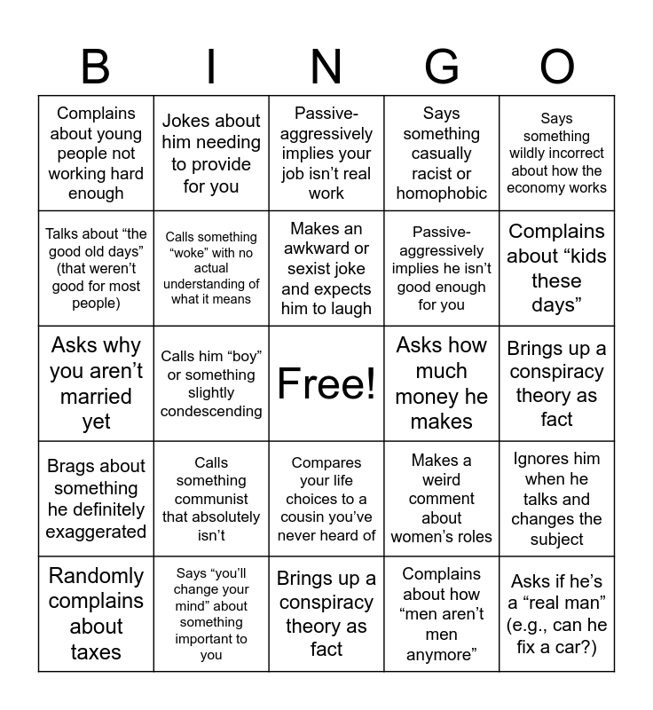This bingo card has a free space and 48 words: Grills him about his job, Asks if he’s a “real man” (e.g., can he fix a car?), Says something completely incorrect about politics, Brings up a conspiracy theory as fact, Calls something communist that absolutely isn’t, “So, what are your intentions with my daughter?”, Jokes about him needing to provide for you, Insists he needs to be a churchgoer, Talks about “the good old days” (that weren’t good for most people), Exaggerates a story about himself to sound impressive, Calls something “woke” with no actual understanding of what it means, Says something casually racist or homophobic, Ignores him when he talks and changes the subject, Makes a weird comment about women’s roles, Claims his generation was the last to have “real values”, Randomly starts talking about guns, Makes an awkward or sexist joke and expects him to laugh, Asks how much money he makes, Tries to bait him into a political debate, Says something wildly incorrect about how the economy works, Calls him “boy” or something slightly condescending, Complains about how “men aren’t men anymore”, Complains about young people not working hard enough, Passive-aggressively implies he isn’t good enough for you, Makes a bad joke about how marriage = misery, Complains about “kids these days”, Randomly complains about taxes, Suggests an outdated or completely incorrect financial tip, Compares your life choices to a cousin you’ve never heard of, Brags about something he definitely exaggerated, Says something sexist (bonus if about you), Tries to start a political debate, Says something about “real men” or “real women”, Brings up Fox News as if it’s gospel, Says “you’ll change your mind” about something important to you, Heavy sigh and disappointed head shake, Says something aggressively wrong about history, Brings up a conspiracy theory as fact, Uses “back in my day” to justify a bad opinion, Insists you need to go to church more, “We didn’t have [basic human rights] growing up, and we turned out fine”, Complains about “woke” culture, Passive-aggressively implies your job isn’t real work, Makes a comment about a woman’s appearance, Asks why you aren’t married yet, Says something homophobic or racist and then claims he’s just joking, Asks why you don’t visit more but makes no effort to be pleasant and Claims your generation is too soft.