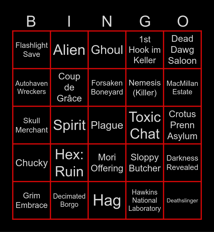 This bingo card has 130 words: 3-Gen-Chase, Alien, Artist, Billy, Blight, Bubba, Chucky, Clown, Deathslinger, Demo, Doctor, Dracula, Knight, Dredge, Freddy, Ghostface, Hag, Houndmaster, Huntress, Legion, Michael Myers, Nemesis (Killer), Nurse, Oni, Pig, Pinhead, Plague, Pyramid Head, Sadako, Singularity, Skull Merchant, Spirit, Trapper, Trickster, Twins, Unknown, Vecna, Wesker, Wraith, Slugger, Toxic Chat, 2x Uwe nacheinander, Jemand escaped durch die Luke, Candy wird beim Verstecken erwischt, Franz verwechselt Perks, Scourge Pain Resonance, Corrupt Intervention, Hex: Ruin, NOED, Sloppy Butcher, Hit & Run Killer, Grim Embrace, Hex: Blood Favour, Hex: Pentimento, BBQ & Chilli, Pop, High Ping Killer, Jemand wird gemori'ed, Michael Myers mit Full Tombstone, Face-Camp-o-meter ist voll, Wir haben uns ge-3-Gen'ed, Ken vermasselt das Dead Hard Timing, Cheating Killer, Nowhere to Hide, Weave Attunement & Franklin's, Flashlight Save, Map Offering, Killer DC'ed, MacMillan Estate, Autohaven Wreckers, Coldwind Farm, Crotus Prenn Asylum, Haddonfield, Backwater Swamp, Léry's Memorial Institute, Red Forest, Springwood, Gideon Meat Plant, Yamaoka Estate, Ormond, Hawkins National Laboratory, Dead Dawg Saloon, Midwich Elementary School, RPD, Forsaken Boneyard, Whithered Island, Decimated Borgo, Dvarka Deepwood, Wholesome Killer im Chat, Pallet Save, 4k bei 5 Gens an, Sacrificial Ward, Mori Offering, Jemand wird gehumped, Proxi-Camping Killer, 3x die gleiche Killerfigur nacheinander, 4k bei 0 Gens an, Ghoul, Coup de Grâce, Jemand fliegt aus der Lobby / muss neustarten, Jemand spielt mit dem Surv, der eigentlich nur gelevelt wird (Upsi), Agitation, 1st Hook im Keller, Jemand wiggled sich frei, Bamboozle, Blood Warden, Darkness Revealed, Dead Man's Switch, Deadlock, Dissolution, Spirit Fury & Enduring, Eruption, Forced Hesitation, Hex: Devour Hope, Mori durch Hex: Devour Hope, Hubris, I'm All Ears, Insidious, Full Aura-Build des Killers, Lightborn, Make Your Choice, Rancor, Spies from the Shadows, Starstruck, Superior Anatomy, Thanatophobia, Tinkerer, Unbound, Zanshin Tactics and Predator.
