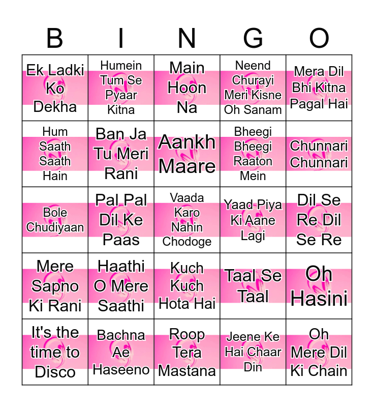 This bingo card has 36 images and 36 words: Aaj Kal Tere Mere, Aane Wala Pal, Kajra Re Kajra Re, Bheegi Bheegi Raaton Mein, Oh Hasini, It's the time to Disco, Ban Ja Tu Meri Rani, Dilbar Dilbar, Neend Churayi Meri Kisne Oh Sanam, Ek Mein Aur Ek Tu, Bole Chudiyaan, Humein Tum Se Pyaar Kitna, Kuch Kuch Hota Hai, Jeene Ke Hai Chaar Din, Dil Se Re Dil Se Re, Ek Ladki Ko Dekha, Bachna Ae Haseeno, Main Hoon Na, Taal Se Taal, Mera Dil Bhi Kitna Pagal Hai, Mere Sapno Ki Rani, Haathi O Mere Saathi, Aankh Maare, Chand Mera Dil, Oh Mere Dil Ki Chain, Hum Saath Saath Hain, Pal Pal Dil Ke Paas, Roop Tera Mastana, Yaad Piya Ki Aane Lagi, Chunnari Chunnari, Tum Bin, Mein toh ainvayi ainvayi, Vaada Karo Nahin Chodoge, Yeh Jo Mohobbat Hai, Yeh Sama- Sama Hai Yeh Pyar Ka and Test.