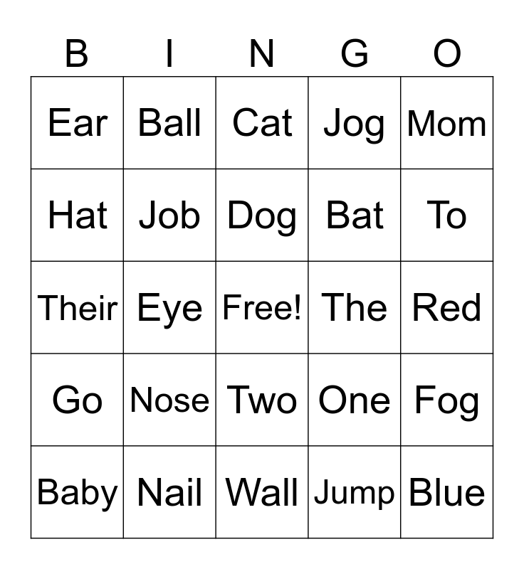 This bingo card has a free space and 34 words: Hop, Jump, Up, Lot, Go, Job, Mom, Baby, Ball, Foot, Dog, Cat, Log, Did, The, To, Nail, Their, Nose, One, Two, Knee, Ear, Red, Wall, Blue, Jog, Sing, Bat, Hat, Head, Eye, Fog and Door.
