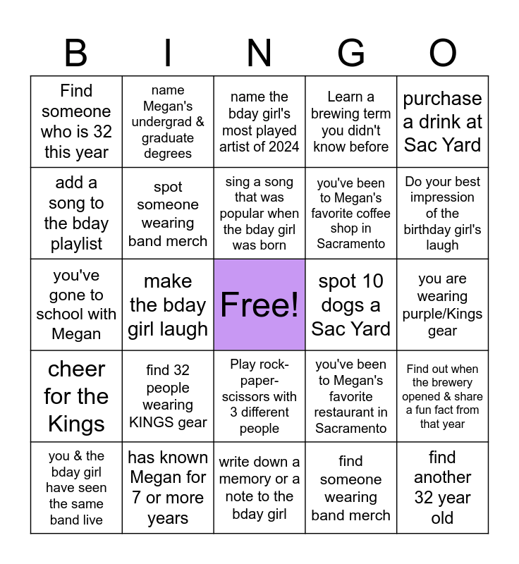 This bingo card has a free space and 29 words: you & the bday girl have seen the same band live, use a beer-related pun in conversation, make the bday girl laugh, take a picture with the birthday girl, Find someone who is 32 this year, name the bday girl's most played artist of 2024, spot someone wearing band merch, find 32 people wearing KINGS gear, spot 10 dogs a Sac Yard, has known Megan for 7 or more years, you are wearing purple/Kings gear, find another 32 year old, write down a memory or a note to the bday girl, find someone wearing band merch, Do your best impression of the birthday girl's laugh, call the bday girl by her nickname(s), Play rock-paper-scissors with 3 different people, cheer for the Kings, purchase a drink at Sac Yard, you've gone to school with Megan, you've been to Megan's favorite restaurant in Sacramento, you've been to Megan's favorite bar in Sacramento, you've been to Megan's favorite coffee shop in Sacramento, add a song to the bday playlist, Learn a brewing term you didn't know before, name Megan's undergrad & graduate degrees, Find out when the brewery opened & share a fun fact from that year, sing a song that was popular when the bday girl was born and give the bday girl 32 cents.