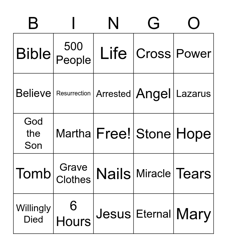 This bingo card has a free space and 24 words: Grave Clothes, 6 Hours, Arrested, Willingly Died, Power, Bible, Believe, 500 People, Stone, Nails, Angel, God the Son, Miracle, Tears, Resurrection, Eternal, Hope, Life, Lazarus, Martha, Mary, Tomb, Cross and Jesus.