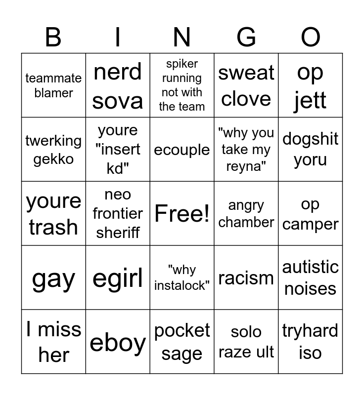 This bingo card has a free space and 24 words: egirl, eboy, ecouple, I miss her, op jett, teammate blamer, twerking gekko, nerd sova, angry chamber, "why instalock", "why you take my reyna", youre trash, racism, autistic noises, youre "insert kd", solo raze ult, op camper, spiker running not with the team, dogshit yoru, neo frontier sheriff, tryhard iso, gay, sweat clove and pocket sage.