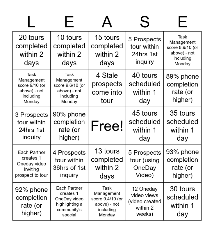 This bingo card has a free space and 24 words: 4 Prospects tour within 36hrs of 1st inquiry, Each Partner creates 1 OneDay video highlighting a community's special, 4 Stale prospects come into tour, 92% phone completion rate (or higher), Task Management score 8.9/10 (or above) - not including Monday, 20 tours completed within 2 days, Task Management score 9/10 (or above) - not including Monday, 10 tours completed within 2 days, 45 tours scheduled within 1 day, 13 tours completed within 2 days, 40 tours scheduled within 1 day, 3 Prospects tour within 24hrs 1st inquiry, 5 Prospects tour (using OneDay Video), 93% phone completion rate (or higher), Task Management score 9.6/10 (or above) - not including Monday, 12 Oneday video views (video created within 2 weeks), 35 tours scheduled within 1 day, 15 tours completed within 2 days, 89% phone completion rate (or higher), 90% phone completion rate (or higher), 30 tours scheduled within 1 day, Each Partner creates 1 Oneday video inviting prospect to tour, 5 Prospects tour within 24hrs 1st inquiry and Task Management score 9.4/10 (or above) - not including Monday.