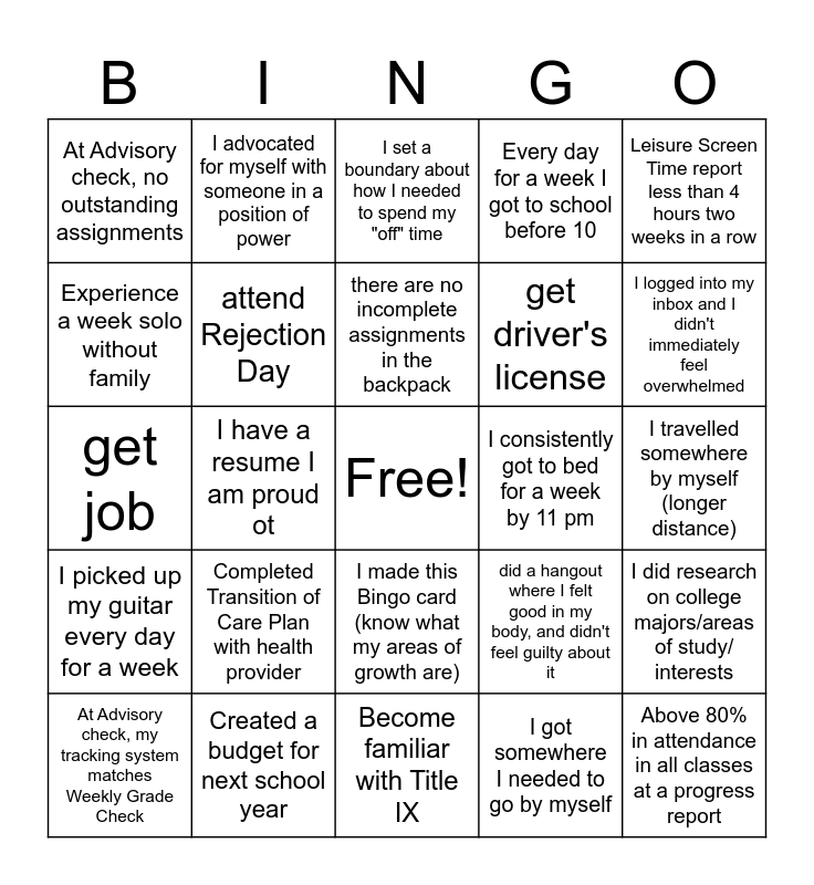 This bingo card has a free space and 24 words: Completed Transition of Care Plan with health provider, Created a budget for next school year, there are no incomplete assignments in the backpack, At Advisory check, my tracking system matches Weekly Grade Check, Leisure Screen Time report less than 4 hours two weeks in a row, At Advisory check, no outstanding assignments, Experience a week solo without family, I advocated for myself with someone in a position of power, I consistently got to bed for a week by 11 pm, I made this Bingo card (know what my areas of growth are), get driver's license, get job, did a hangout where I felt good in my body, and didn't feel guilty about it, I did research on college majors/areas of study/ interests, attend Rejection Day, I got somewhere I needed to go by myself, I travelled somewhere by myself (longer distance), I set a boundary about how I needed to spend my "off" time, I logged into my inbox and I didn't immediately feel overwhelmed, I have a resume I am proud ot, Above 80% in attendance in all classes at a progress report, I picked up my guitar every day for a week, Every day for a week I got to school before 10 and Become familiar with Title IX.