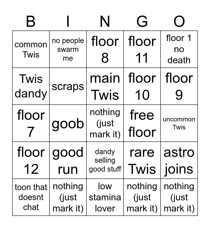 This bingo card has 25 words: good run, low stamina lover, main Twis, toon that doesnt chat, floor 1 no death, common Twis, Twis dandy, no people swarm me, free floor, dandy selling good stuff, floor 10, floor 7, rare Twis, astro joins, scraps, nothing (just mark it), uncommon Twis, floor 8, floor 9, goob, nothing (just mark it), nothing (just mark it), floor 12, floor 11 and nothing (just mark it).