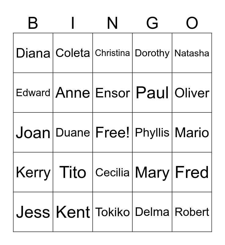 This bingo card has a free space and 24 words: Tito, Kent, Ensor, Jess, Natasha, Diana, Edward, Coleta, Phyllis, Cecilia, Paul, Joan, Mary, Fred, Anne, Delma, Mario, Christina, Oliver, Duane, Robert, Kerry, Dorothy and Tokiko.