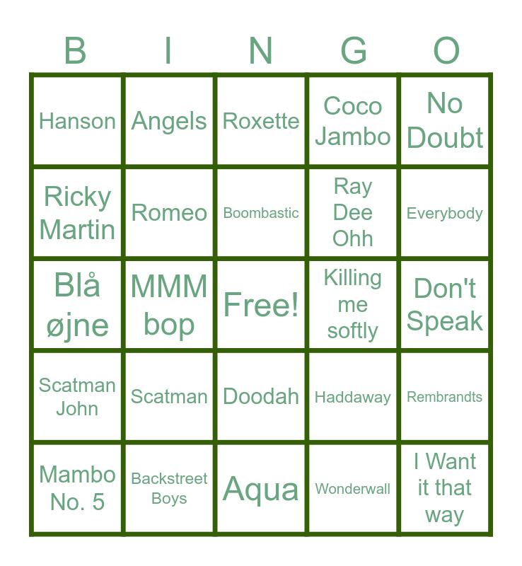 This bingo card has a free space and 64 words: King of my castle, Wamdue Project, I'll be there for you, Rembrandts, Baby one more time, Britney Spears, Angels, Robbie Williams, Boombastic, Shaggy, Doodah, Cartoons, Don't Speak, No Doubt, Livin' La vida loca, Ricky Martin, MMM bop, Hanson, Jeg vil la' lyset brænde, Ray Dee Ohh, Scatman, Scatman John, Coco Jambo, MR. President, Stupid man, Thomas Helmig, Ice Ice Baby, Vanilla Ice, One of us, Joan Osborne, Black or White, Micheal Jackson, No matter what, Boyzone, Everybody, Mambo No. 5, Lou Bega, Wonderwall, Oasis, Romeo, Blå øjne, Killing me softly, Fugees, My heart will go on, Celine Dion, I Want it that way, Backstreet Boys, What is love, Haddaway, Gangsta's paradise, Coolio, Barbie Girl, Aqua, Blue, Eiffel 65, It must have been love, Roxette, Believe, Cher, Cotton eye joe, Rednex, Wannabe, Spice girl and Backstreet Boys.