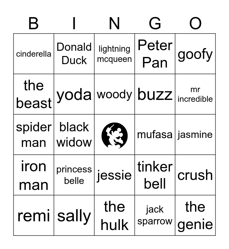 This bingo card has a free space and 24 words: princess belle, sally, woody, remi, goofy, cinderella, the beast, Donald Duck, mufasa, jessie, buzz, spider man, tinker bell, crush, yoda, jack sparrow, jasmine, lightning mcqueen, mr incredible, black widow, the genie, iron man, Peter Pan and the hulk.