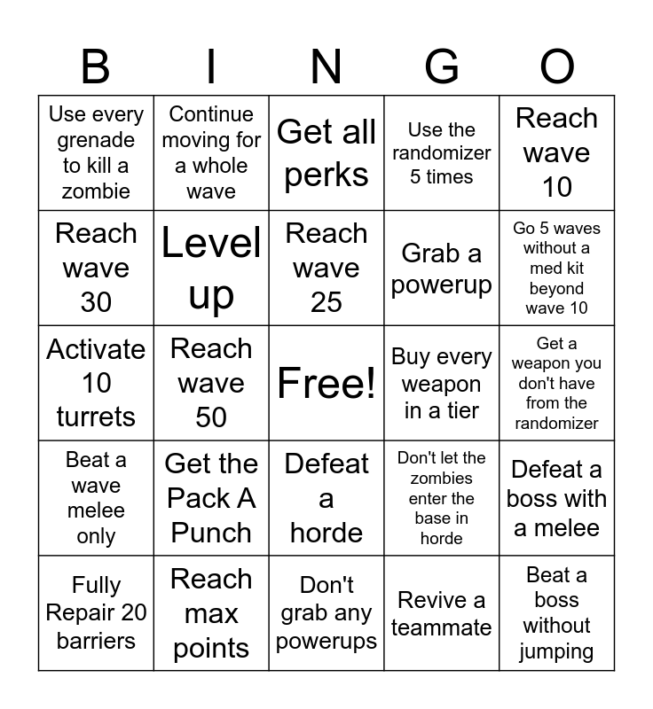 This bingo card has a free space and 24 words: Get the Pack A Punch, Reach max points, Reach wave 25, Fully Repair 20 barriers, Reach wave 10, Use every grenade to kill a zombie, Reach wave 30, Continue moving for a whole wave, Buy every weapon in a tier, Defeat a horde, Grab a powerup, Activate 10 turrets, Don't let the zombies enter the base in horde, Defeat a boss with a melee, Level up, Revive a teammate, Get a weapon you don't have from the randomizer, Get all perks, Go 5 waves without a med kit beyond wave 10, Reach wave 50, Beat a boss without jumping, Beat a wave melee only, Use the randomizer 5 times and Don't grab any powerups.