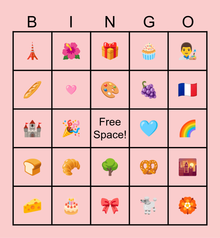 This bingo card has a free space and 24 words: 🥐, 🎂, 🎨, 🧀, 👨🎨, 🗼, 🥖, 🌺, 🩵, 🌳, 🍇, 🏰, 🥨, 🌇, 🩷, 🐩, 🌈, 🎁, 🇫🇷, 🎉, 🏵️, 🍞, 🧁 and 🎀.
