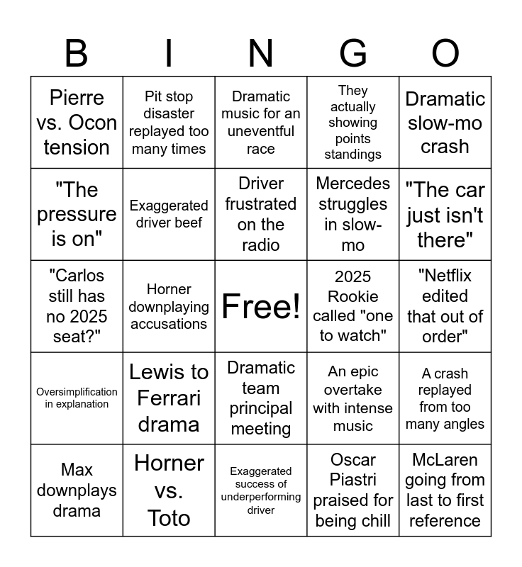 This bingo card has a free space and 24 words: Lewis to Ferrari drama, Horner vs. Toto, Driver frustrated on the radio, Max downplays drama, Dramatic slow-mo crash, Pierre vs. Ocon tension, "The pressure is on", Pit stop disaster replayed too many times, 2025 Rookie called "one to watch", Dramatic team principal meeting, Mercedes struggles in slow-mo, "Carlos still has no 2025 seat?", An epic overtake with intense music, A crash replayed from too many angles, Exaggerated driver beef, Oscar Piastri praised for being chill, "Netflix edited that out of order", Dramatic music for an uneventful race, "The car just isn't there", Horner downplaying accusations, McLaren going from last to first reference, Oversimplification in explanation, They actually showing points standings and Exaggerated success of underperforming driver.