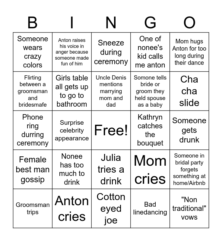 This bingo card has a free space and 24 words: Nonee has too much to drink, Anton cries, Uncle Denis mentions marrying mom and dad, Groomsman trips, Mom hugs Anton for too long during their dance, Someone wears crazy colors, Flirting between a groomsman and bridesmafe, Anton raises his voice in anger because someone made fun of him, Kathryn catches the bouquet, Julia tries a drink, Somone tells bride or groom they held spouse as a baby, Phone ring durring ceremony, Mom cries, Someone in bridal party forgets something at home/Airbnb, Girls table all gets up to go to bathroom, Bad linedancing, Someone gets drunk, Sneeze during ceremony, Cha cha slide, Surprise celebrity appearance, "Non traditional" vows, Female best man gossip, One of nonee's kid calls me anton and Cotton eyed joe.