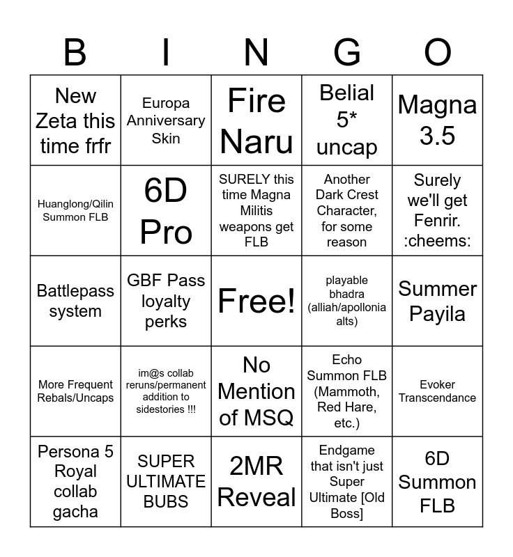 This bingo card has a free space and 26 words: No Mention of MSQ, Endgame that isn't just Super Ultimate [Old Boss], SURELY this time Magna Militis weapons get FLB, SUPER ULTIMATE BUBS, Magna 3.5, New Zeta this time frfr, Huanglong/Qilin Summon FLB, Europa Anniversary Skin, Summer Payila, Echo Summon FLB (Mammoth, Red Hare, etc.), Another Dark Crest Character, for some reason, Battlepass system, Evoker Transcendance, Persona 5 Royal collab gacha, GBF Pass loyalty perks, Spark @ 200 rolls, Belial 5* uncap, More Frequent Rebals/Uncaps, Fire Naru, 6D Summon FLB, Surely we'll get Fenrir. :cheems:, 2MR Reveal, playable bhadra (alliah/apollonia alts), im@s collab reruns/permanent addition to sidestories !!!, 6D Pro and New Gold Moon Sink.