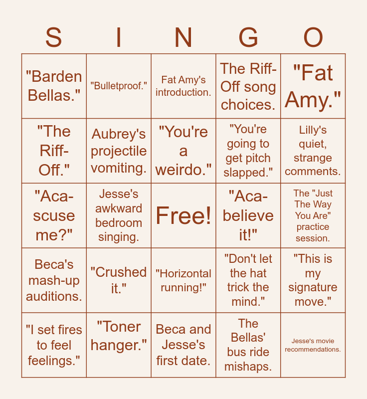This bingo card has a free space and 24 words: "Crushed it.", "Toner hanger.", "You're a weirdo.", "I set fires to feel feelings.", "Fat Amy.", "Barden Bellas.", "The Riff-Off.", "Bulletproof.", "Aca-believe it!", "Horizontal running!", "You're going to get pitch slapped.", "Aca-scuse me?", "Don't let the hat trick the mind.", "This is my signature move.", Aubrey's projectile vomiting., The Bellas' bus ride mishaps., The "Just The Way You Are" practice session., Fat Amy's introduction., Lilly's quiet, strange comments., Jesse's awkward bedroom singing., Jesse's movie recommendations., Beca's mash-up auditions., The Riff-Off song choices. and Beca and Jesse's first date..