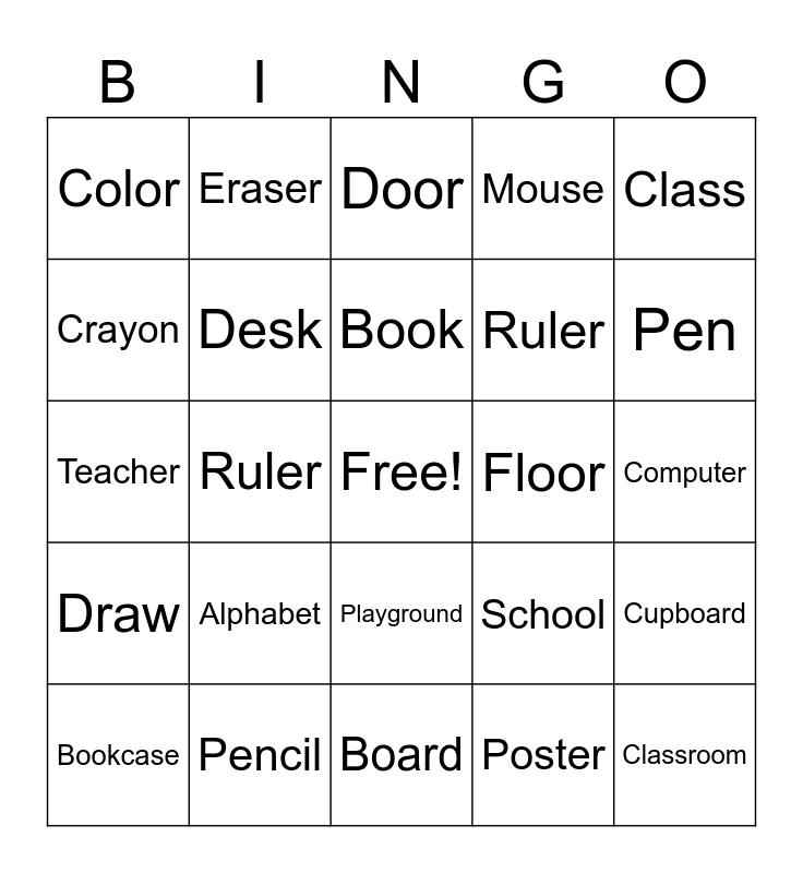 This bingo card has a free space and 25 words: Alphabet, Board, Book, Bookcase, Class, Color, Crayon, Eraser, Floor, Playground, Ruler, Teacher, School, Cupboard, Desk, Picture, Computer, Door, Pen, Ruler, Classroom, Pencil, Draw, Mouse and Poster.