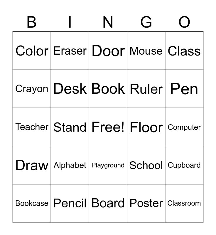 This bingo card has a free space and 25 words: Alphabet, Board, Book, Bookcase, Class, Color, Crayon, Eraser, Floor, Playground, Ruler, Teacher, School, Cupboard, Desk, Picture, Computer, Door, Pen, Stand, Classroom, Pencil, Draw, Mouse and Poster.