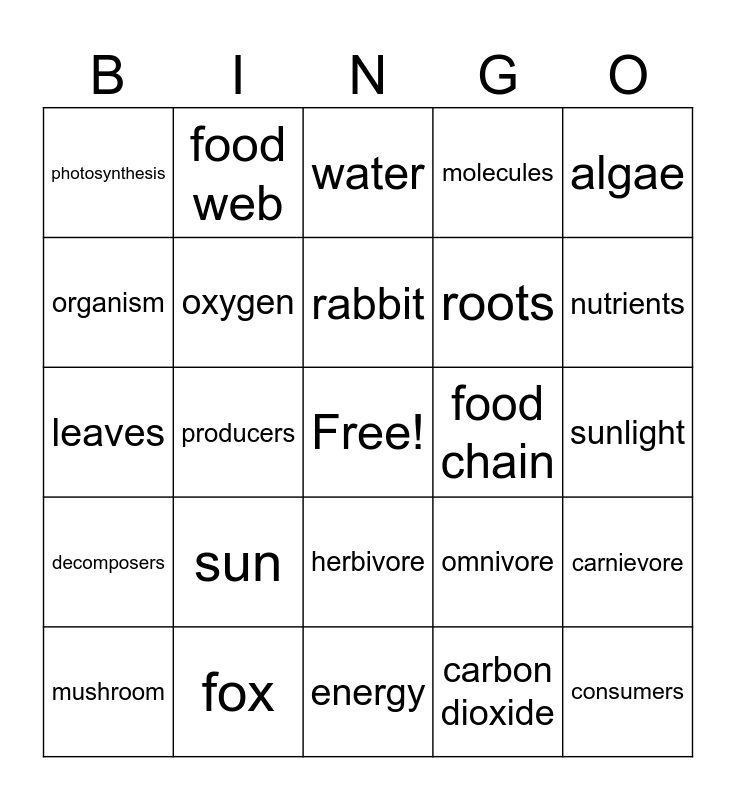 This bingo card has a free space and 24 words: sun, fox, rabbit, mushroom, algae, photosynthesis, organism, food web, food chain, herbivore, roots, leaves, omnivore, carnievore, oxygen, carbon dioxide, sunlight, water, nutrients, producers, consumers, decomposers, molecules and energy.