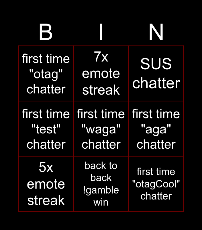 This bingo card has a free space and 8 words: first time "aga" chatter, SUS chatter, 7x emote streak, 5x emote streak, first time "otag" chatter, first time "otagCool" chatter, first time "test" chatter and back to back !gamble win.