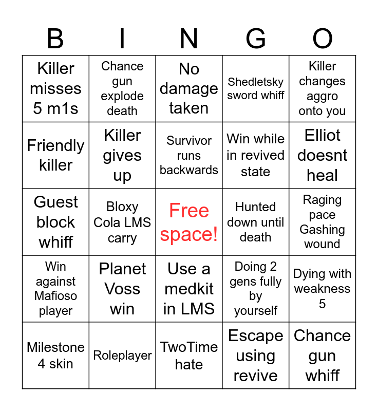 This bingo card has a free space and 24 words: Planet Voss win, Roleplayer, Survivor runs backwards, Milestone 4 skin, Killer changes aggro onto you, Killer misses 5 m1s, Friendly killer, Chance gun explode death, Hunted down until death, Use a medkit in LMS, Win while in revived state, Guest block whiff, Doing 2 gens fully by yourself, Dying with weakness 5, Killer gives up, Escape using revive, Raging pace Gashing wound, No damage taken, Elliot doesnt heal, Bloxy Cola LMS carry, Chance gun whiff, Win against Mafioso player, Shedletsky sword whiff and TwoTime hate.
