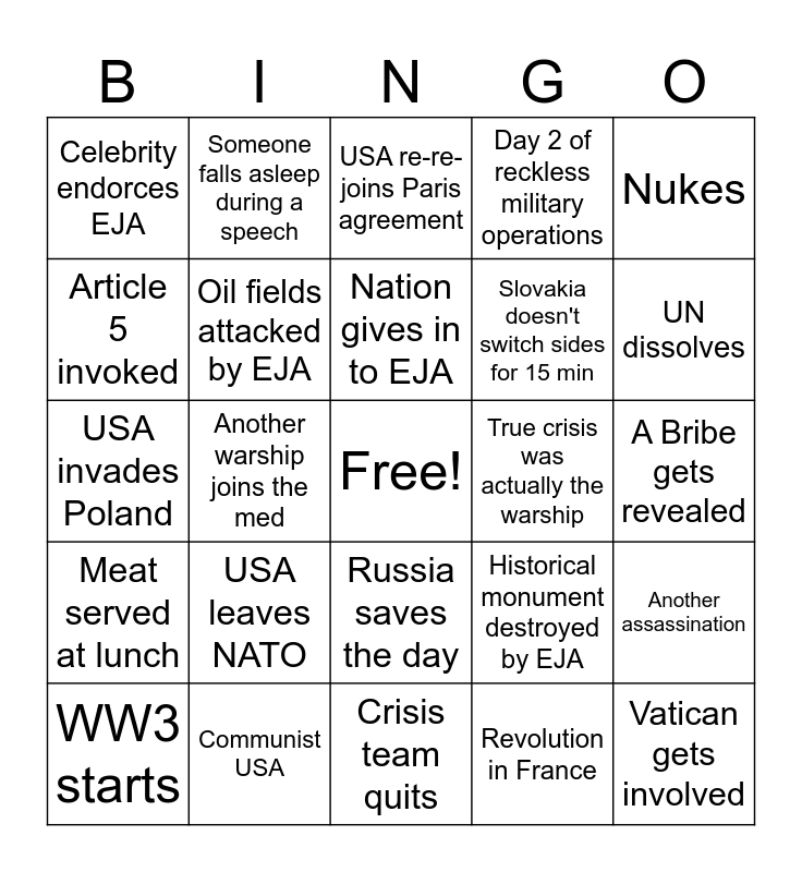 This bingo card has a free space and 24 words: USA leaves NATO, Communist USA, Nation gives in to EJA, WW3 starts, Nukes, Celebrity endorces EJA, Article 5 invoked, Someone falls asleep during a speech, True crisis was actually the warship, Russia saves the day, Slovakia doesn't switch sides for 15 min, USA invades Poland, Historical monument destroyed by EJA, Another assassination, Oil fields attacked by EJA, Revolution in France, A Bribe gets revealed, USA re-re-joins Paris agreement, UN dissolves, Another warship joins the med, Vatican gets involved, Meat served at lunch, Day 2 of reckless military operations and Crisis team quits.