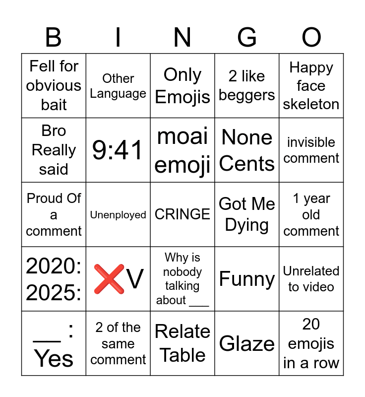 This bingo card has a free space and 24 words: ❌V, 2 of the same comment, moai emoji, __ : Yes, Happy face skeleton, Fell for obvious bait, Bro Really said, Other Language, Got Me Dying, Why is nobody talking about ___, None Cents, Proud Of a comment, Funny, Unrelated to video, 9:41, Glaze, 1 year old comment, Only Emojis, invisible comment, Unenployed, 20 emojis in a row, 2020: 2025:, 2 like beggers and Relate Table.
