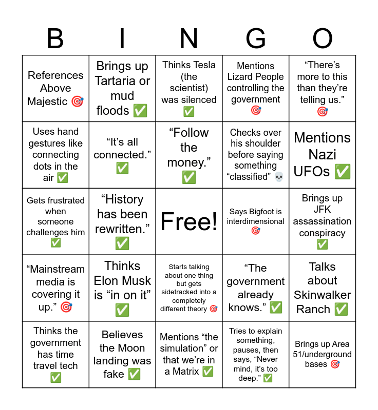 This bingo card has a free space and 36 words: “You have to wake up, man.” ✅, “Do your own research.” 🎯, “They don’t want you to know the truth.” 🎯, “It’s all connected.” ✅, “The government already knows.” ✅, “Mainstream media is covering it up.” 🎯, “Follow the money.” ✅, “Look at the ancient texts.” ✅, “There’s more to this than they’re telling us.” 🎯, “They’ve been hiding this for years.” 🎯, “History has been rewritten.” ✅, Mentions Lizard People controlling the government 🎯, Brings up Antarctica conspiracies ✅, Says Bigfoot is interdimensional 🎯, Mentions Nazi UFOs ✅, References Above Majestic 🎯, Says aliens built the pyramids ✅, Thinks Elon Musk is “in on it” ✅, Brings up Area 51/underground bases 🎯, Thinks Tesla (the scientist) was silenced ✅, Brings up JFK assassination conspiracy ✅, Talks about Skinwalker Ranch ✅, Believes the Moon landing was fake ✅, Thinks the government has time travel tech ✅, Mentions “the simulation” or that we’re in a Matrix ✅, Brings up Tartaria or mud floods ✅, Gets frustrated when someone challenges him ✅, Leans in and lowers his voice like he’s revealing something dangerous 🎯, Checks over his shoulder before saying something “classified” 💀, Uses hand gestures like connecting dots in the air ✅, Says, “I can’t say too much about this, but…” 🎯, Mentions having “sources” but doesn’t specify who ✅, Tries to explain something, pauses, then says, “Never mind, it’s too deep.” ✅, Starts talking about one thing but gets sidetracked into a completely different theory 🎯, Says, “You’ll see. Just wait.” 💀 and Looks at the bartender suspiciously ✅.