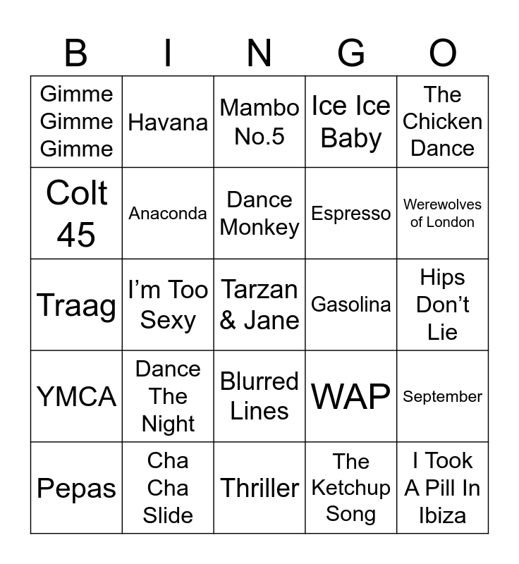 This bingo card has 41 words: Knock Knock, Traag, Suavemente, Anaconda, Cha Cha Slide, Blurred Lines, Dance Monkey, Calabria 2008, The Chicken Dance, YMCA, I’m Too Sexy, Ice Ice Baby, Tarzan & Jane, Hips Don’t Lie, Gasolina, Dance The Night, Follow The Leader, Gimme Gimme Gimme, Cotton Eye Joe, Mambo No.5, September, I Took A Pill In Ibiza, Thriller, Espresso, Danza Kuduro, Uptown Funk, The Ketchup Song, I’m Gonna Be (500 Miles), Werewolves of London, Friday, Hot To Go!, Havana, Pepas, Macarena, WAP, Colt 45, Levitating, Zorba, Hot Hot Hot, Tubthumping and Denial Is A River.