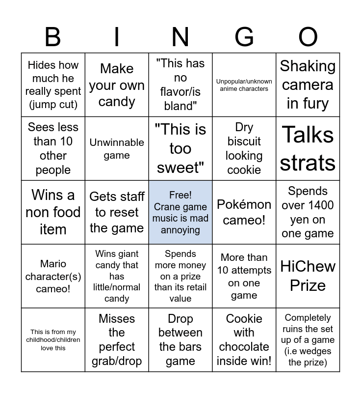 This bingo card has a free space and 24 words: Wins giant candy that has little/normal candy, Misses the perfect grab/drop, "This is too sweet", This is from my childhood/children love this, Shaking camera in fury, Hides how much he really spent (jump cut), Sees less than 10 other people, Make your own candy, Pokémon cameo!, Spends more money on a prize than its retail value, Dry biscuit looking cookie, Wins a non food item, More than 10 attempts on one game, HiChew Prize, Unwinnable game, Cookie with chocolate inside win!, Spends over 1400 yen on one game, "This has no flavor/is bland", Talks strats, Gets staff to reset the game, Completely ruins the set up of a game (i.e wedges the prize), Mario character(s) cameo!, Unpopular/unknown anime characters and Drop between the bars game.