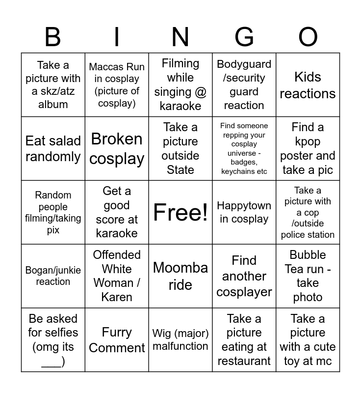 This bingo card has a free space and 24 words: Offended White Woman / Karen, Furry Comment, Take a picture outside State, Be asked for selfies (omg its ___), Kids reactions, Take a picture with a skz/atz album, Eat salad randomly, Maccas Run in cosplay (picture of cosplay), Happytown in cosplay, Moomba ride, Find someone repping your cosplay universe - badges, keychains etc, Random people filming/taking pix, Find another cosplayer, Bubble Tea run - take photo, Broken cosplay, Take a picture eating at restaurant, Take a picture with a cop /outside police station, Filming while singing @ karaoke, Find a kpop poster and take a pic, Get a good score at karaoke, Take a picture with a cute toy at mc, Bogan/junkie reaction, Bodyguard /security guard reaction and Wig (major) malfunction.