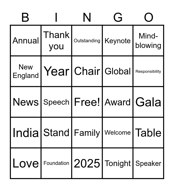 This bingo card has a free space and 38 words: Woman, Phenomenal, Amazing, Year, Table, Stand, Chair, Round of Applause, Mind-blowing, Global, Speech, Keynote, Speaker, Gala, New England, India, South Asian, Outstanding, Honor, Award, Annual, Foundation, Responsibility, Love, Children, 2025, Excellent, Wonderful, Journey, Adventure, Grace, Family, Tonight, Thank you, Dinner, Welcome, News and Journal.