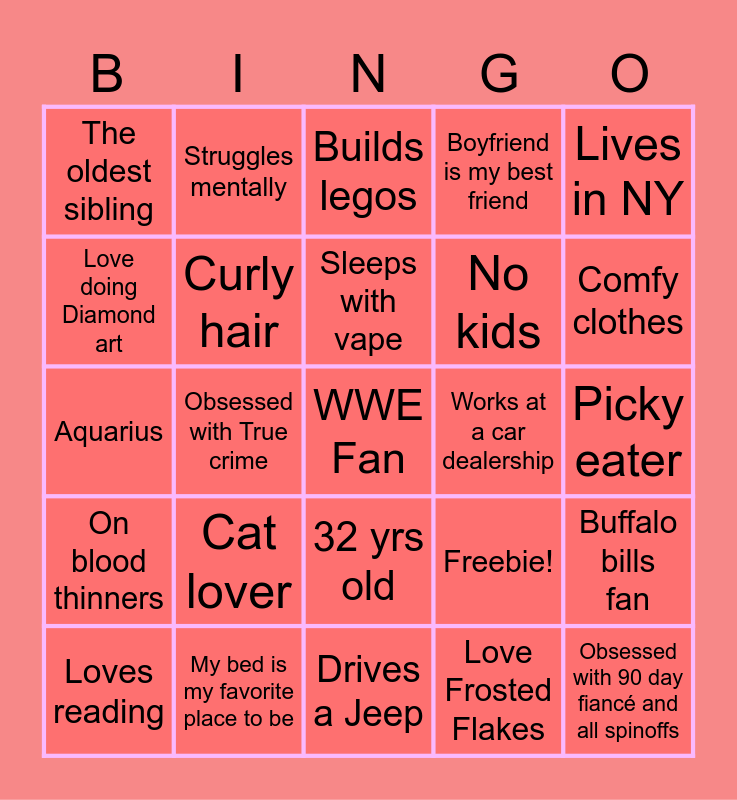 This bingo card has 25 words: Cat lover, Drives a Jeep, Sleeps with vape, Loves reading, Lives in NY, The oldest sibling, Love doing Diamond art, Struggles mentally, Works at a car dealership, 32 yrs old, No kids, Aquarius, Freebie!, Buffalo bills fan, Curly hair, Obsessed with 90 day fiancé and all spinoffs, Picky eater, Builds legos, Comfy clothes, Obsessed with True crime, WWE Fan, My bed is my favorite place to be, On blood thinners, Boyfriend is my best friend and Love Frosted Flakes.