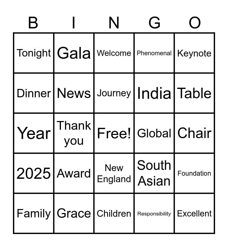 This bingo card has a free space and 38 words: Amazing, Outstanding, Speaker, News, Foundation, Award, Journey, Journal, Keynote, India, Thank you, Phenomenal, Excellent, Chair, Dinner, 2025, Love, Welcome, Round of Applause, Global, Tonight, Grace, Table, Family, Wonderful, Children, Annual, Mind-blowing, Stand, Woman, Speech, New England, Responsibility, Gala, Honor, South Asian, Year and Adventure.