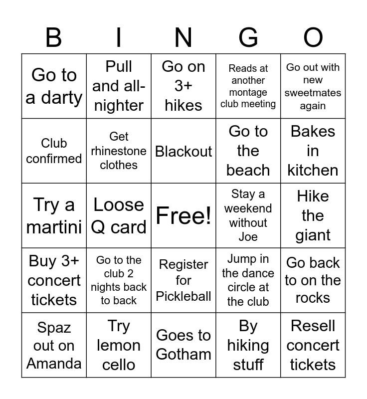 This bingo card has a free space and 24 words: Go to the club 2 nights back to back, Try lemon cello, Blackout, Spaz out on Amanda, Go out with new sweetmates again, Go to a darty, Club confirmed, Pull and all-nighter, Stay a weekend without Joe, Register for Pickleball, Go to the beach, Try a martini, Jump in the dance circle at the club, Go back to on the rocks, Get rhinestone clothes, By hiking stuff, Hike the giant, Go on 3+ hikes, Bakes in kitchen, Loose Q card, Resell concert tickets, Buy 3+ concert tickets, Reads at another montage club meeting and Goes to Gotham.